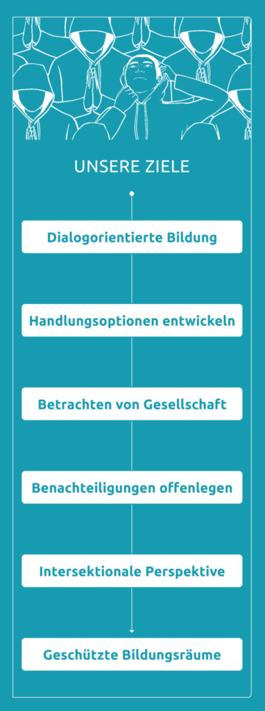 - die Entwicklung dialogorientierter Bildungsformate, in welche alle Teilnehmenden und ihre Perspektiven mit aufgenommen werden,